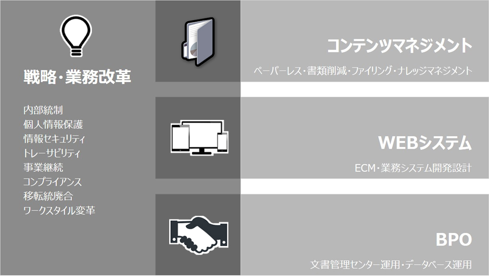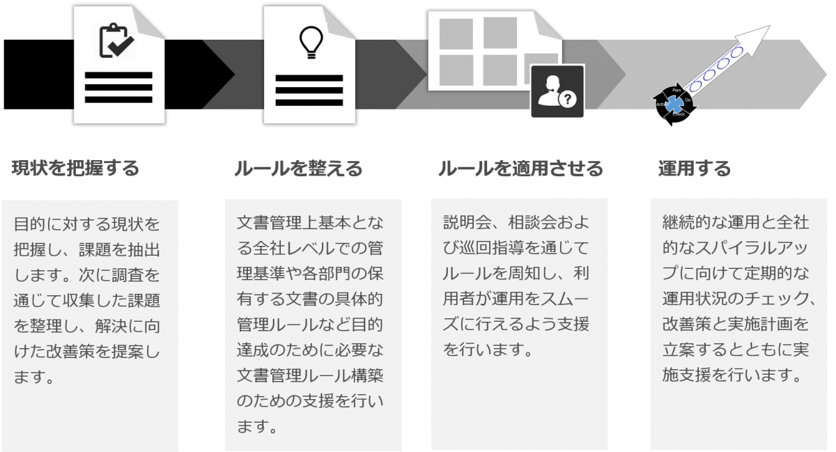 お客様の様々な経営戦略の実行に合わせ、文書に関するトータルソリューションをご提供します。