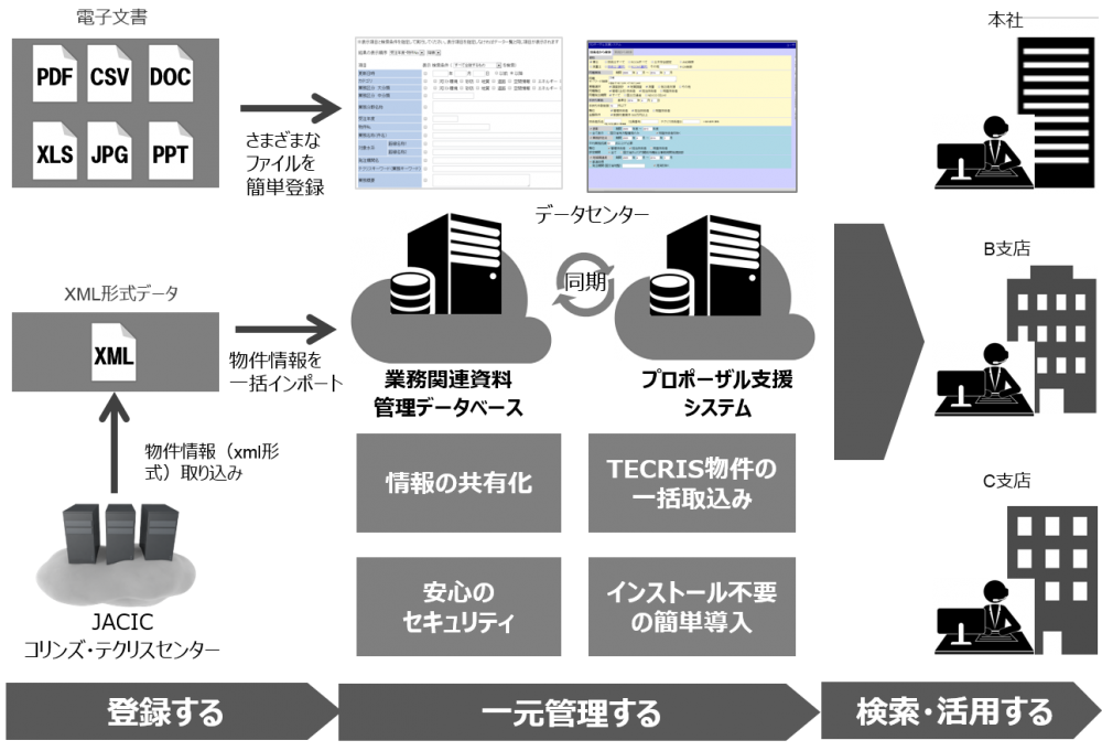 業務関連資料、技術者の情報を管理・共有し、プロポーザルにおける技術者選定の効率化を支援するシステムです。